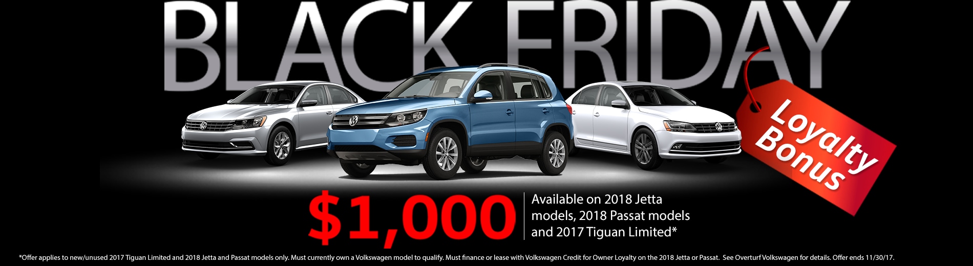 *Offer applies to new/unused 2018 Jetta and Passat and 2017 Tiguan Limited models only. Must finance with VW Credit to get loyalty bonus on the 2018 Jetta and Passat. On approved credit. Must currently own a Volkswagen model to qualify. No trade in required. See Overturf Volkswagen for details. Offer ends 11/30/17.