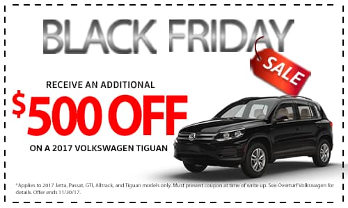 *Offer applies to new/unused in stock 2017 Jetta models only. Must present coupon at time of write up. May be combined with $4,500 Off MSRP offer for a total of $5,000 Off MSRP. Must finance with VW credit using Dealer Second Choice program. On approved credit. See Overturf Volkswagen for details. Offer ends 11/30/17.