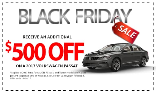 *Offer applies to new/unused in stock 2017 Passat models only. Must present coupon at time of write up. May be combined with $4,500 Off MSRP offer for a total of $5,000 Off MSRP. Must finance with VW credit using Dealer Second Choice program. On approved credit. See Overturf Volkswagen for details. Offer ends 11/30/17.