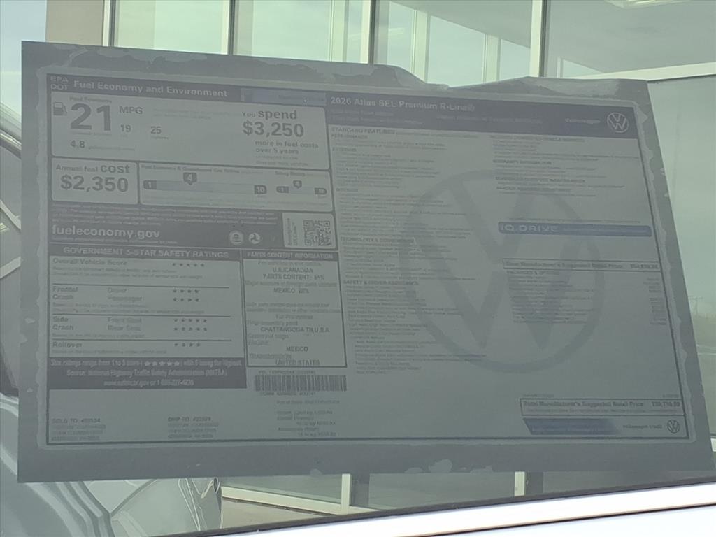 In stock. Please contact our sales team for availability, details, & a test drive! | Here are reasons why our customers love owning an Atlas & why you should consider purchasing a new 2026 Volkswagen Atlas: 1. The 26 Atlas is designed for real families with room for up to 7 passengers & generous legroom in all 3 rows. Easy access to the 3rd row in which adults can comfortably ride in the third row, & great cargo space with the rear seats folded, making it excellent for road trips, sports gear, or hauling big loads. | 2. Owners often appreciate the Atlas for its straightforward usability. Inside, the Atlas offers a comfortable & thoughtfully appointed environment. Standard seating includes heated & ventilated front seats, a heated steering wheel, tri-zone climate control, & a digital gauge cluster features you might expect in more expensive SUVs. Higher trims bring luxury touches like massaging seats, leather upholstery, & panoramic sunroof options. All with thoughtful storage to plenty of cupholders & well-placed controls throughout the cabin. | 3. Technology is a strong point on the 26 Atlas. Every model comes with wireless Apple CarPlay and Android Auto, multiple USB-C ports, wireless phone charging, & an available premium Harman Kardon audio system. An available head-up display help keep key info right in your line of sight. | 4. Volkswagen equips the 26 Atlas with a full suite of driver-assist tech through its IQ.DRIVE system. Standard features include automatic emergency braking, blind-spot monitoring, adaptive cruise control, lane-keeping assist, & more designed to help make daily driving & highway trips safer & less stressful. | 5. Powered by a turbocharged 2.0 TSI® engine, the Atlas delivers confident merging & passing performance and its rated to tow up to 5,000 lbs when properly equipped, giving it versatility for camping trailers or boats. | Sale price excludes sales tax, licensing, & $200 negotiable dealer documentati