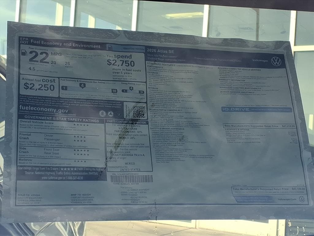 In stock. Please contact our sales team for availability, details, & a test drive! | Here are reasons why our customers love owning an Atlas & why you should consider purchasing a new 2026 Volkswagen Atlas: 1. The 26 Atlas is designed for real families with room for up to 7 passengers & generous legroom in all 3 rows. Easy access to the 3rd row in which adults can comfortably ride in the third row, & great cargo space with the rear seats folded, making it excellent for road trips, sports gear, or hauling big loads. | 2. Owners often appreciate the Atlas for its straightforward usability. Inside, the Atlas offers a comfortable & thoughtfully appointed environment. Standard seating includes heated & ventilated front seats, a heated steering wheel, tri-zone climate control, & a digital gauge cluster features you might expect in more expensive SUVs. Higher trims bring luxury touches like massaging seats, leather upholstery, & panoramic sunroof options. All with thoughtful storage to plenty of cupholders & well-placed controls throughout the cabin. | 3. Technology is a strong point on the 26 Atlas. Every model comes with wireless Apple CarPlay and Android Auto, multiple USB-C ports, wireless phone charging, & an available premium Harman Kardon audio system. An available head-up display help keep key info right in your line of sight. | 4. Volkswagen equips the 26 Atlas with a full suite of driver-assist tech through its IQ.DRIVE system. Standard features include automatic emergency braking, blind-spot monitoring, adaptive cruise control, lane-keeping assist, & more designed to help make daily driving & highway trips safer & less stressful. | 5. Powered by a turbocharged 2.0 TSI® engine, the Atlas delivers confident merging & passing performance and its rated to tow up to 5,000 lbs when properly equipped, giving it versatility for camping trailers or boats. | Sale price excludes sales tax, licensing, & $200 negotiable dealer documentati