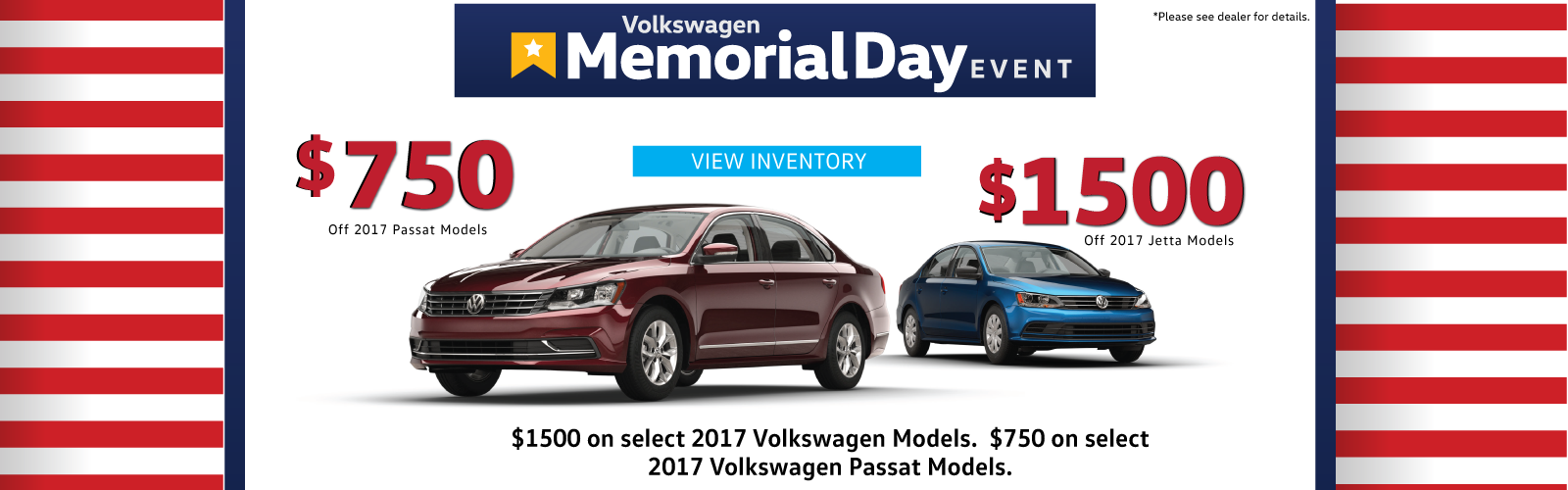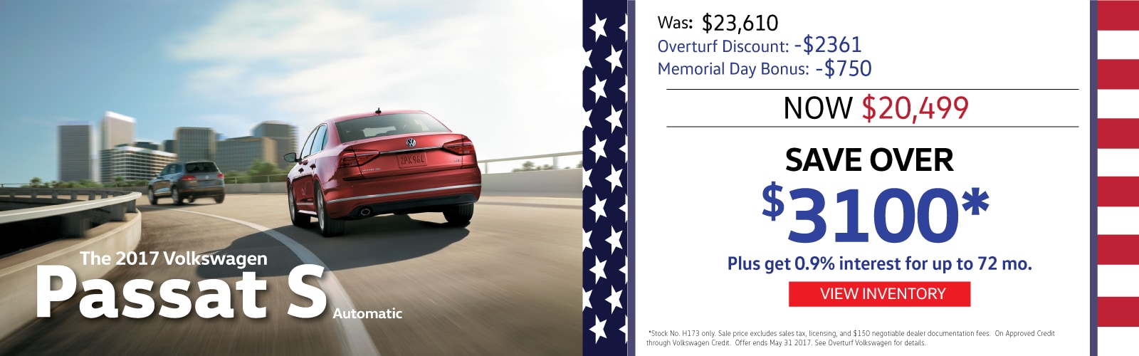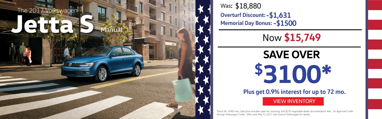 *Jetta special: Stock no. H380 only. Passat special: Stock no. H173 only. Sale prices exclude sales tax, licensing, and $150 negotiable dealer documentation fee. Special APR is on approved credit through VW Credit, Inc. $750 Bonus applies to new/unused 2017 VW Passat models only. $1,500 Bonus applies to new/unused 2017 VW Jetta models only. Memorial Day Special can be combined with low interest and lease offers through VW Credit. See Overturf VW for details. Offers end 5/31/17.